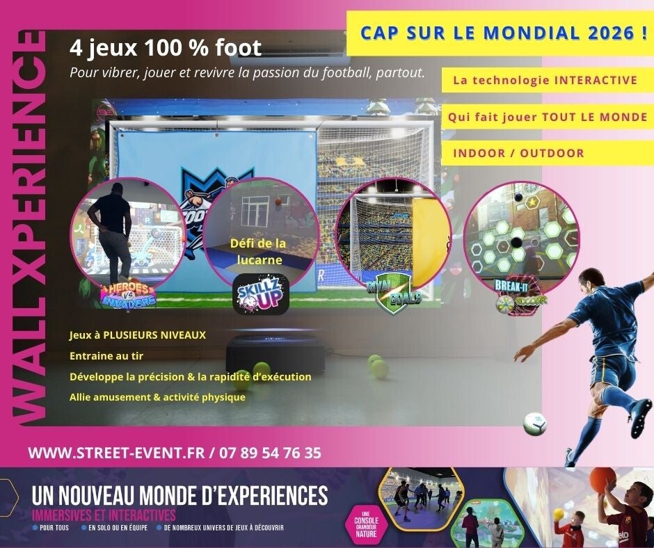 WALL XPERIENCE FOOT est un mur interactif sportif dédié au football, combinant jeux de tir, défis de précision et expériences digitales. Les participants frappent de vrais ballons sur des cibles lumineuses ou interactives, déclenchant scores, effets visuels et challenges en temps réel.